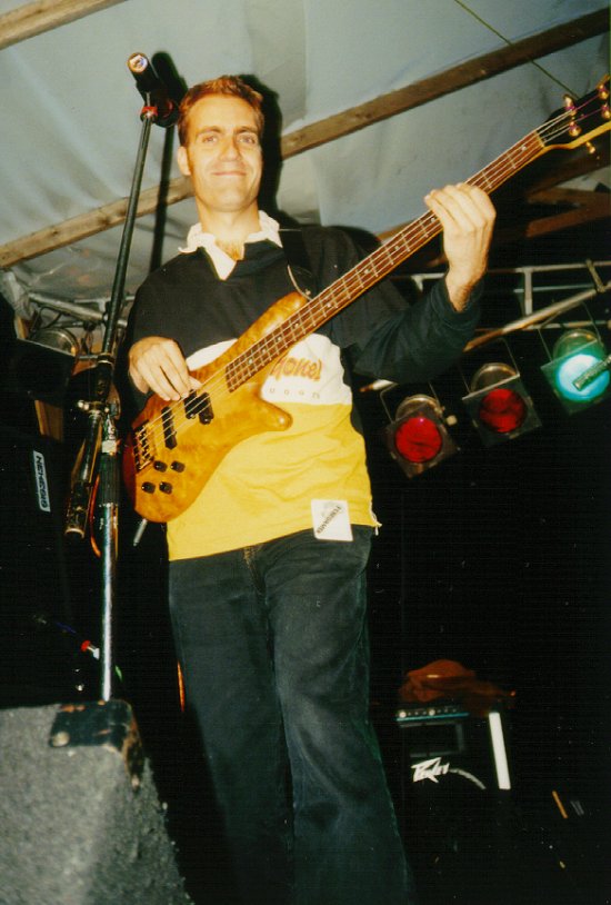 Back at the Fest that evening, things had cooled off considerably (oh, yeah, *that's* why I don't live in Canada. . .) and the mainstage was running quite a bit behind, so we huddled up and listened to several good performers (my favorite was the rockin' Lennie Gallant--he had an excellent fiddler with him, among others) and chatted and marvelled at the extent of Chris O's sunburn (ye gods!). The organizers ended up having to stage somewhere between half an hour and an hour of delay tactics during the lengthy changeover to Fruvous' setup. "Ginger" was by far the best received--a gravel-voiced old man who sang "Oh, Lord, won'tcha buy me a Mercedes Benz" and an admonishment against encouraging the romantic attentions of dogs towards one's legs: "Don't pet the dog."