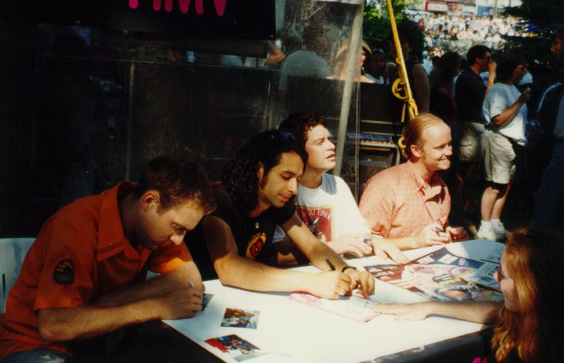 After the set, Moxy was at an HMV tent signing autographs, etc... I met up with Sharilyn, Katie, Zac, Melissa, Rosemary, and others there. There was quite a long line for Fruvous, but we jumped right in and after a while I got to say my hellos to the guys. Marcus' wrist is looking better every day, and Jude was there, stamping cards, and chatting with fans.