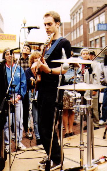 How to say it? The Frumagic was *on* in a way that it hasn't been in some full-length shows I've seen. Nothing but standards and pieces I've seen umpteen-gazillion times, the same basic setlist of the last 3 or 4 shows I've seen (Michigan Militia, Johnny, Boss, BJ, Jockey), and yet it was terrific. They were in absolutely no hurry to get their pieces played and escape the rain, either, talking freely and with joie de vivre for minutes at a time. Mike played with his megaphone, tootling a little tune with it that he expected us to recognize. It took three or four tries to get "Johnny" off the ground and they were laughing the whole time. Murray joked that the show would definitively be over when he sustained a current (his was the only wired mic) and was flung 40 feet away; Jian contributed that this wouldn't be an entirely bad thing, as it would get great press for the release of the live album and Murray would arguably recover in a few years, and Murray agreed that physical deformity isn't all that bad a fate. He also got some ribbing for his attempt to keep his hair dry with a washcloth draped over it. They encouraged the crowd to rush into the stores and loot them, if the rain got to be too much and we needed to scurry for cover, and were delighted when shortly afterwards we heard sirens as if in response to the threat. Dave's acoustic stopped playing and Jian's snare, after a thorough wetting, sounded like a woodblock (which they said was a subliminal message to buy their second album, "Wood," and then said had been replaced by a woodblock on that song in their first album, "Bargainville," hence it was also a subliminal message to buy that). Through it all, they enjoyed themselves and the audience enjoyed themselves, and I guess that's what a Fruvous show comes down to, for me.