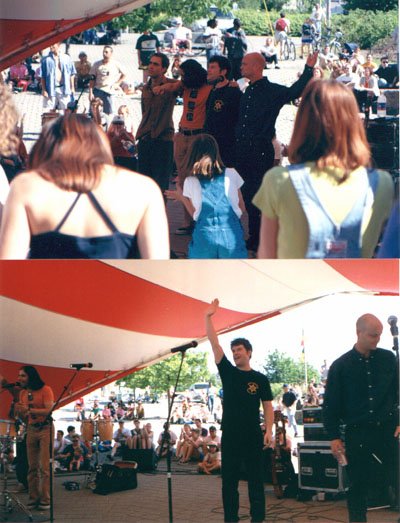 Before Früvous came on, we hooked up with Laurie Addenbrooke and Craig, and found Chris and Moe, too. Then Rosemary came back and we settled about two feet from the stage to watch the show (Ah, shade!). The sound check took A LOT longer than anticipated, much to the dismay of the few hundred people sitting motionless in harsh sunlight who occasionally shouted complaints. All in all, the boys got started about forty-five minutes late, (should I say it?) normal Früvous time.